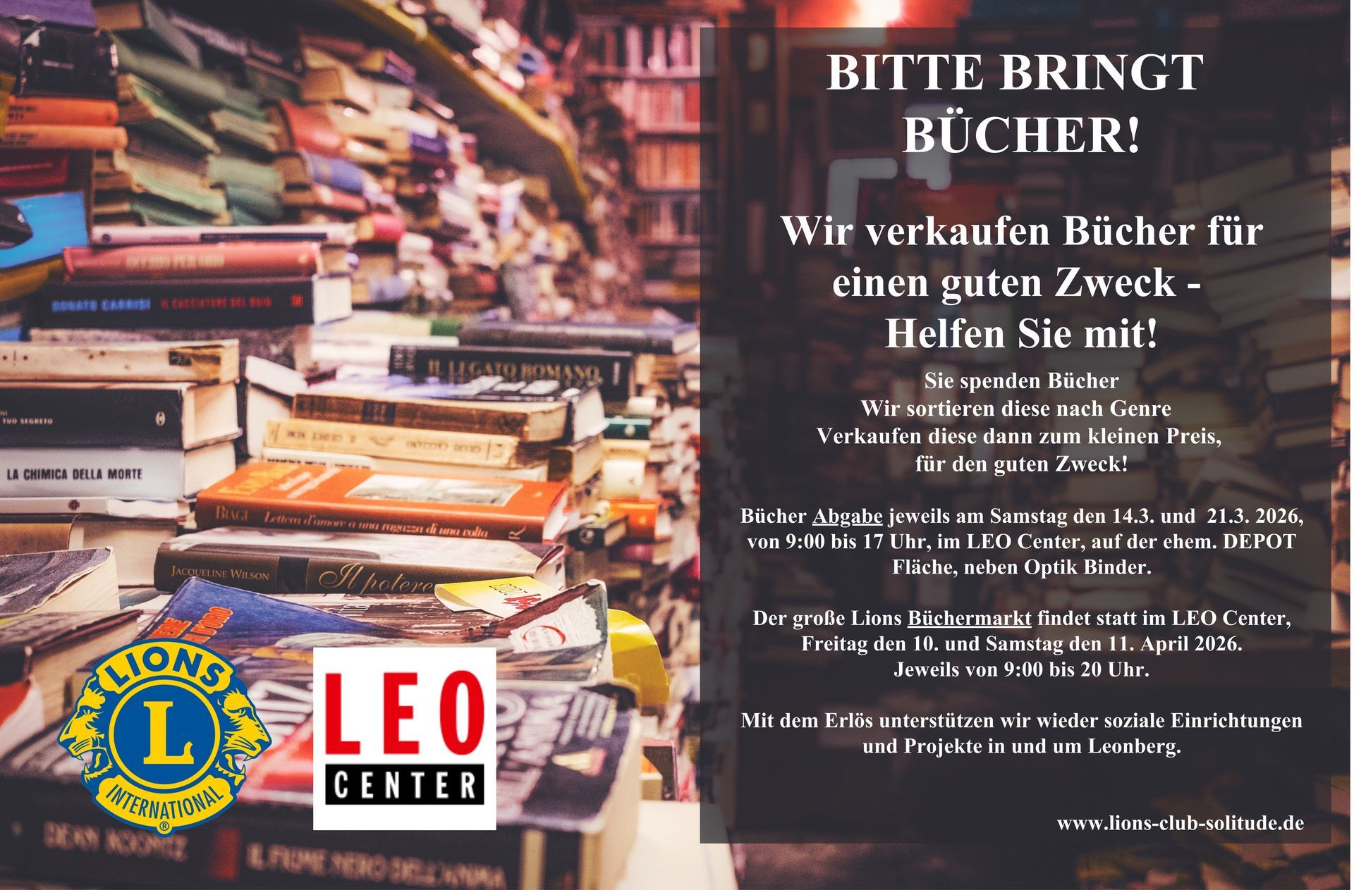 Schon war die Idee geboren, einen Büchermarkt für alle einzurichten. Einmal im Jahr, meist um Ostern herum, stellt uns das Leo-Center-Management Räume kostenlos zur Verfügung, in dem wir an drei Samstagen hintereinander Bücherspenden annehmen. Wir Lions mit unseren Partnerinnen und mit Unterstützung der Leos sortieren mit großem Zeitaufwand die Bücher, welche dann nach Sachthemen auf Verkaufsinseln aufgebaut werden.An zwei Tagen verkaufen wir die Bücher zu extrem günstigen Preisen. Ein gebundenes Buch kostet € 2,00 und fünfzehn kosten nur noch € 20,00. Es gibt Taschenbücher, gebundene Bücher und Bildbände zu unterschiedlichen Staffelpreisen. Dass es sich zu stöbern lohnt, hat sich schon herumgesprochen. Beim Verkauf ist schon ab 9:00 Uhr Hochbetrieb, der erst gegen Abend nachlässt. Im Jahr 2019 werden wir die gesammelten Bücher am Freitag, 26. April und Samstag, 27. April verkaufen.